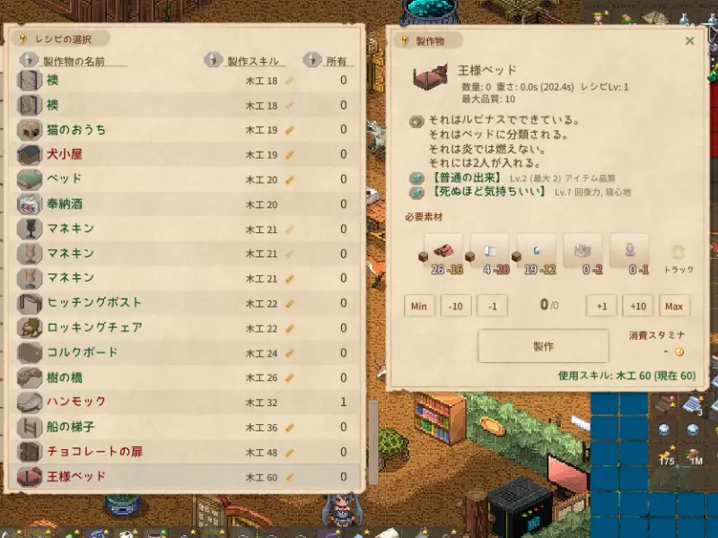 すでに、記事として書いた、不労所得のために王様ベッドを自作しよう計画。まず、木工スキルを60以上にして、王様ベッドを解体、レシピをゲットする、ところまで成功し... -