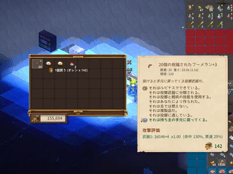 昨日記事に書いた、住人用の武器をケトルさんに頼んで増産する計画なんですが、預けて複製が完成してみたら、なんとブーメラン20個も複製されていました。他の品では、...
