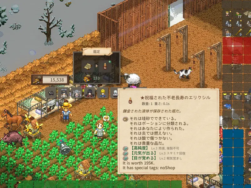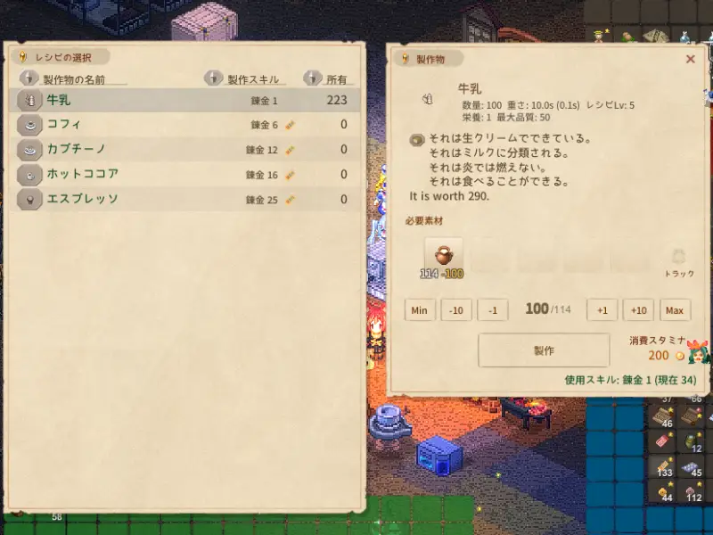 引き続き、不老長寿のエリクシル、遺伝子薬制作のための錬金スキル上げをやっているんですが、染料釜で染料を作るよりも、楽かもと思う手法をつい最近知りました。 それは、家畜がいると猛烈な勢いで貯まっていく乳を、エスプレッソマシーンで牛乳にすると... -