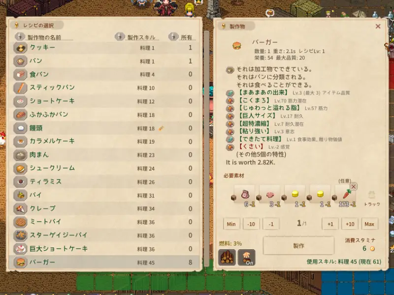 さて、筋力用複製飯を今までコロッケで作ってたんですが、ふと他の料理を見てみると、バーガーのほうが、伸びそうな素材が揃っている? は、と気付いてドラゴンの霜降り肉をふんだんに使って、ドラゴンバーガーを作ってみたら、Lv.57筋力のバーガー爆誕しました。