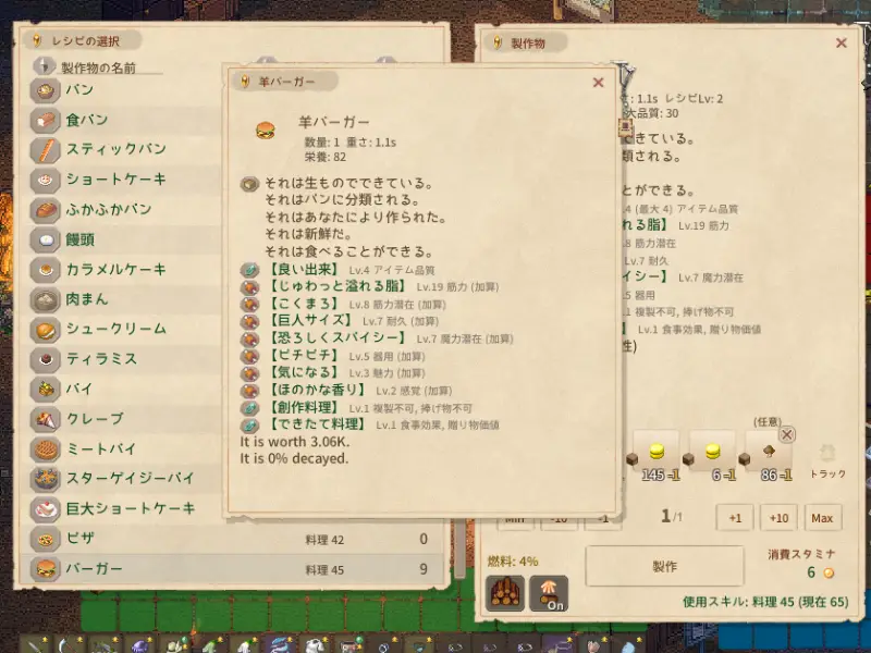 バーガー作りすぎて、筋力が上がる天ぷら粉が枯渇して、ラー油かオリーブオイル出てくれ、売ってくれ状態になってしまっているくらいです。どうせ複製しないならと、コック帽を被って、天ぷら粉の代わりに肉を使用して、ダブル肉ダブルチーズきのこバーガー(なのかこれ?)を作っては仲間の皆さんに配る毎日です。筋力+15~19くらいでも十分上がるんですよね。うらやましい。