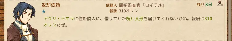 ロイテルさんからの依頼は、「アクリ・テオラに住む隣人に、借りていた呪い人形を届けてくれないかね。報酬は310オレンだぜ。」とのこと。お前、呪われてたんじゃねえかよ!と思わず飲んでいたウイスキーを吹き出しそうになりました。