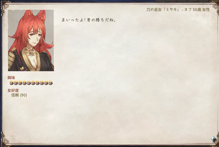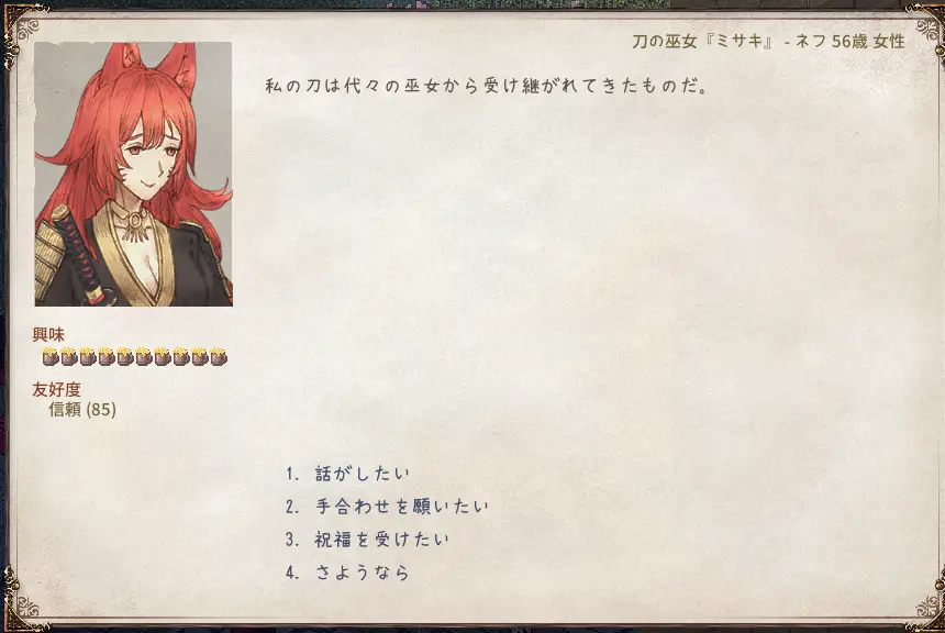 早速、ネフの里に行き、刃の巫女『ミサキ』に、結婚首輪を渡すと友好度が上がって、手合わせが可能に。やあやあ、いざ尋常に勝負いたす!